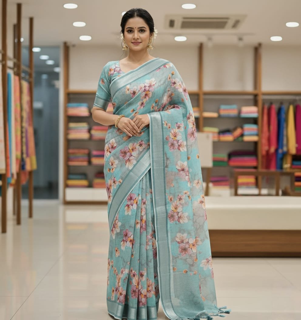 🌸 Product Description: Sky Blue Floral Linen Saree
