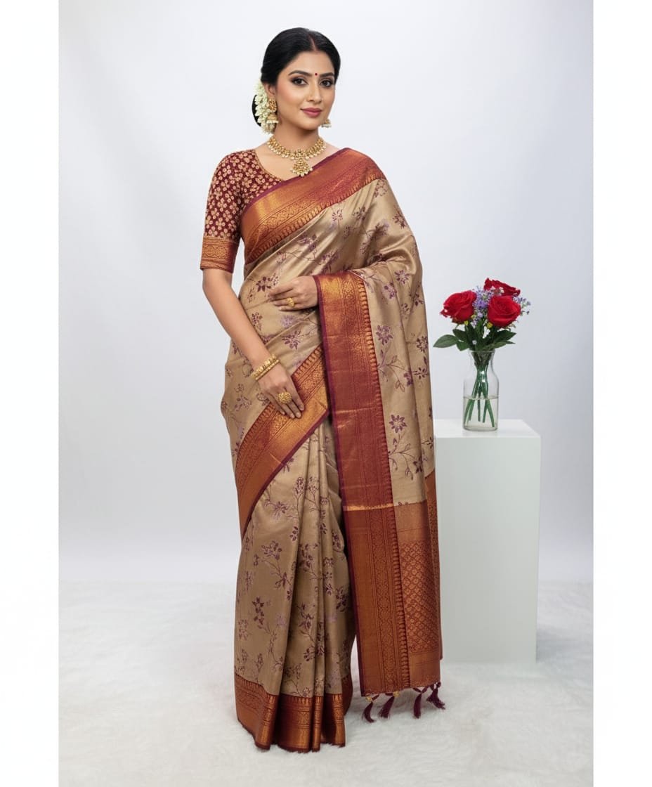 Color Palette: The body of the saree is a striking yet sophisticated color, best described as champagne, dusty beige, or light taupe. This neutral base is beautifully contrasted with a deep wine red or maroon accent.