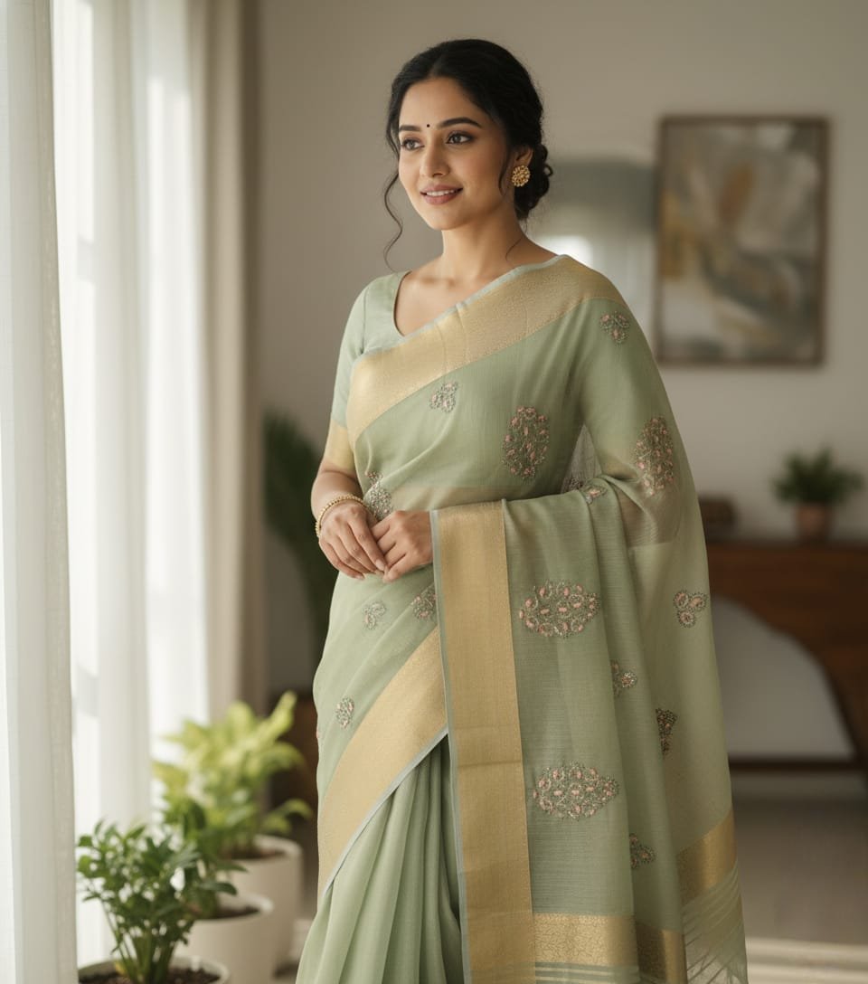 In summary, the model showcases refined elegance in a lightweight sage green saree, featuring delicate pink embroidery and simple gold accents, beautifully highlighted by the soft light of the indoor setting.