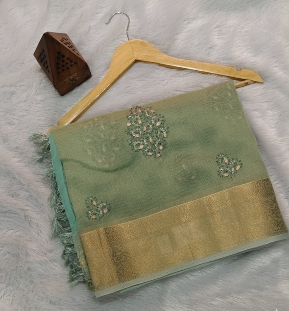 • Color Palette: The body of the saree is a beautiful, muted shade of sage green or light pistachio green. This pale, understated color gives the fabric a gentle and airy feel.