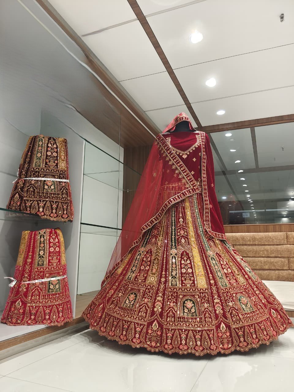 • To the left, there are several other heavily embroidered lehenga skirts displayed vertically on mannequins or hangers, highlighting the store’s selection.