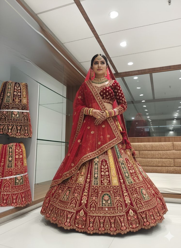 • The choli (blouse) is also red velvet with matching gold work, and the outfit is completed with a sheer red dupatta (scarf) draped over her head, framing her face.