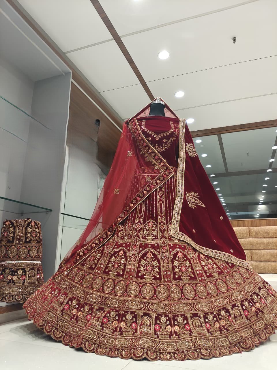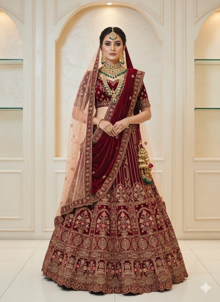 Colour & Fabric: The primary colour is a deep, rich maroon or dark crimson red, which is often associated with traditional Indian weddings. The fabric of the skirt and possibly the dupatta appears to be luxurious, possibly velvet, given its texture and rich drape, or a heavy silk blend.