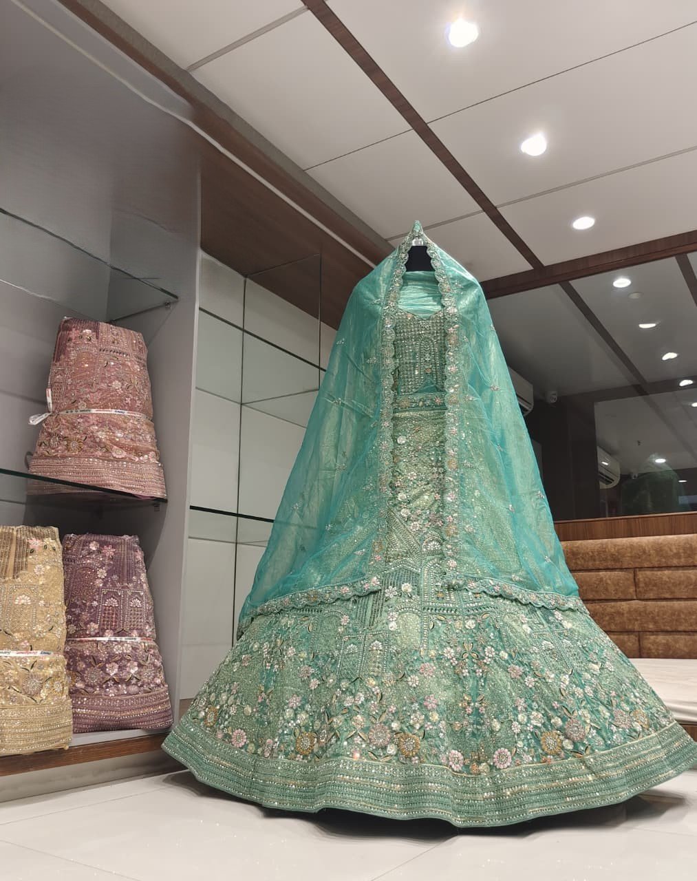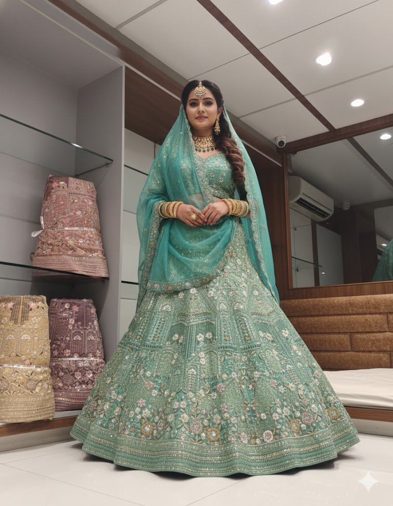 • Overall Aesthetic: This piece combines the grandeur of traditional Indian bridal wear with a fresh, elegant colour choice, making it perfect for a Sangeet, Reception, or a modern wedding ceremony.
