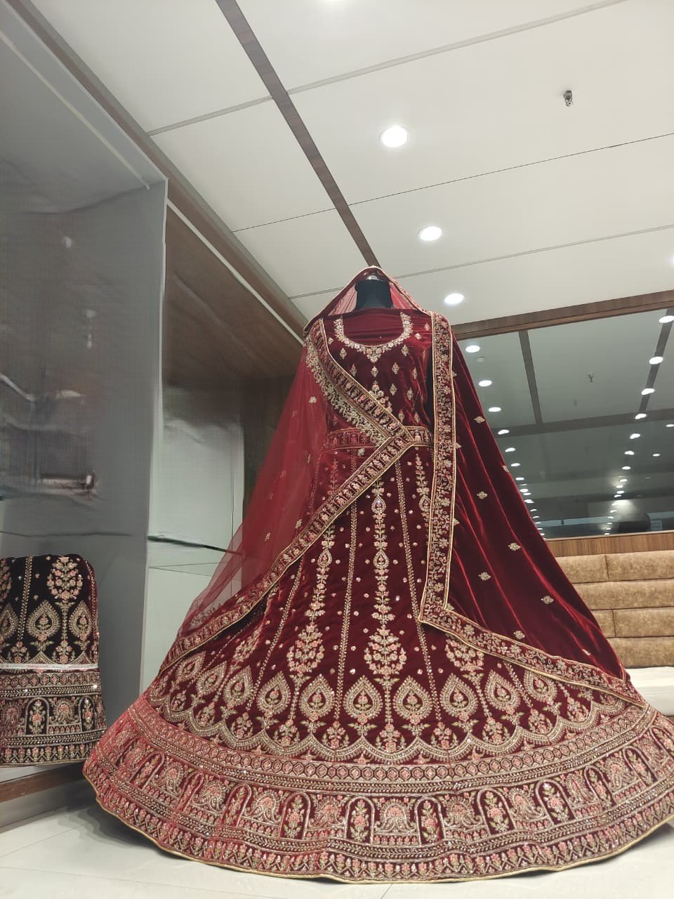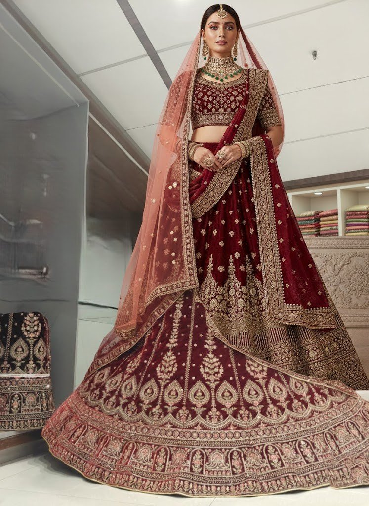 Color and Fabric: The ensemble is rendered in a deep, luxurious maroon or crimson velvet, a classic color for wedding attire.