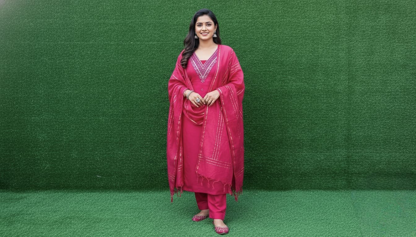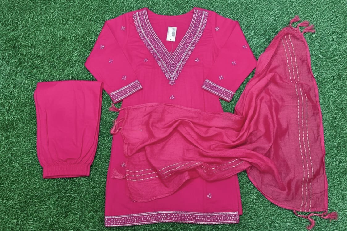This is a beautiful, unstitched or ready-to-wear Indian ethnic wear set in a bright, vibrant shade of rani pink or hot pink. The set appears to be made of cotton or a cotton blend fabric, offering a comfortable, casual yet elegant look.