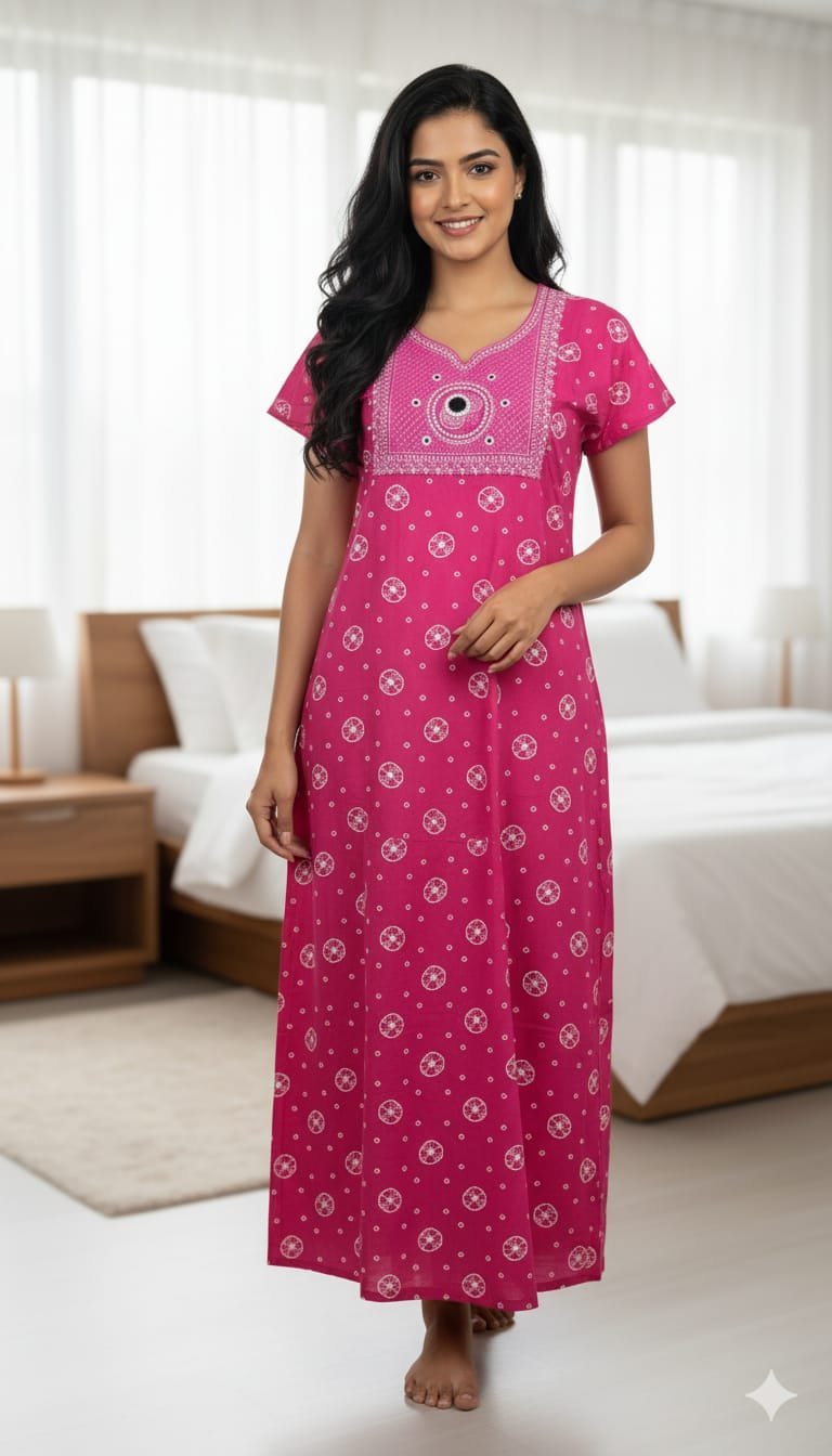 This eye-catching full-length kaftan nighty combines traditional charm with exceptional comfort, perfect for stylish relaxation at home or a peaceful night’s sleep.