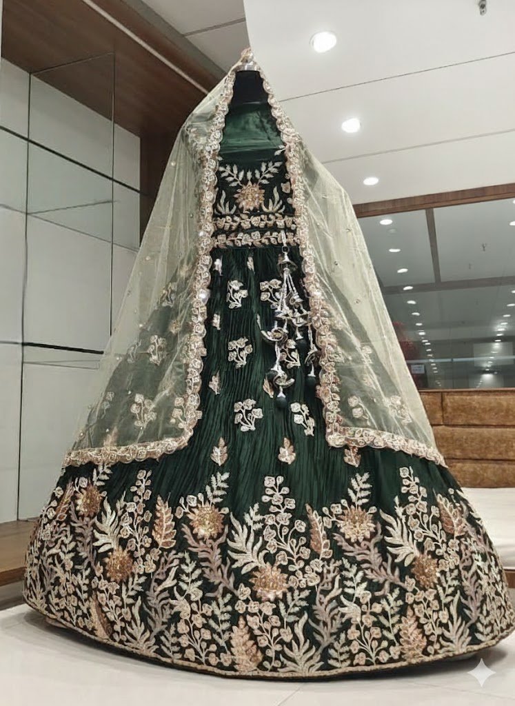 Colour and Fabric: The lehenga is a striking dark emerald green. The accompanying text identifies the primary material as Georgette fabric.