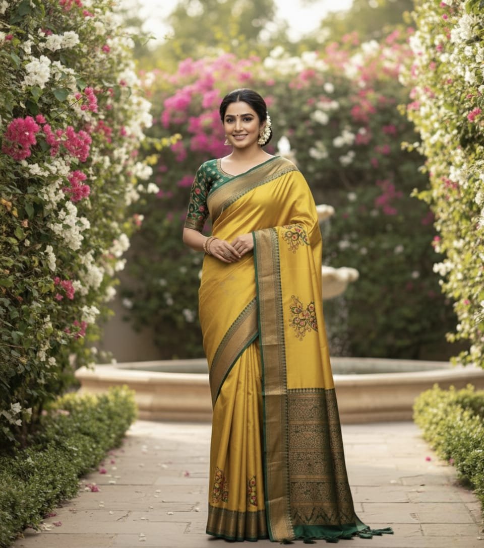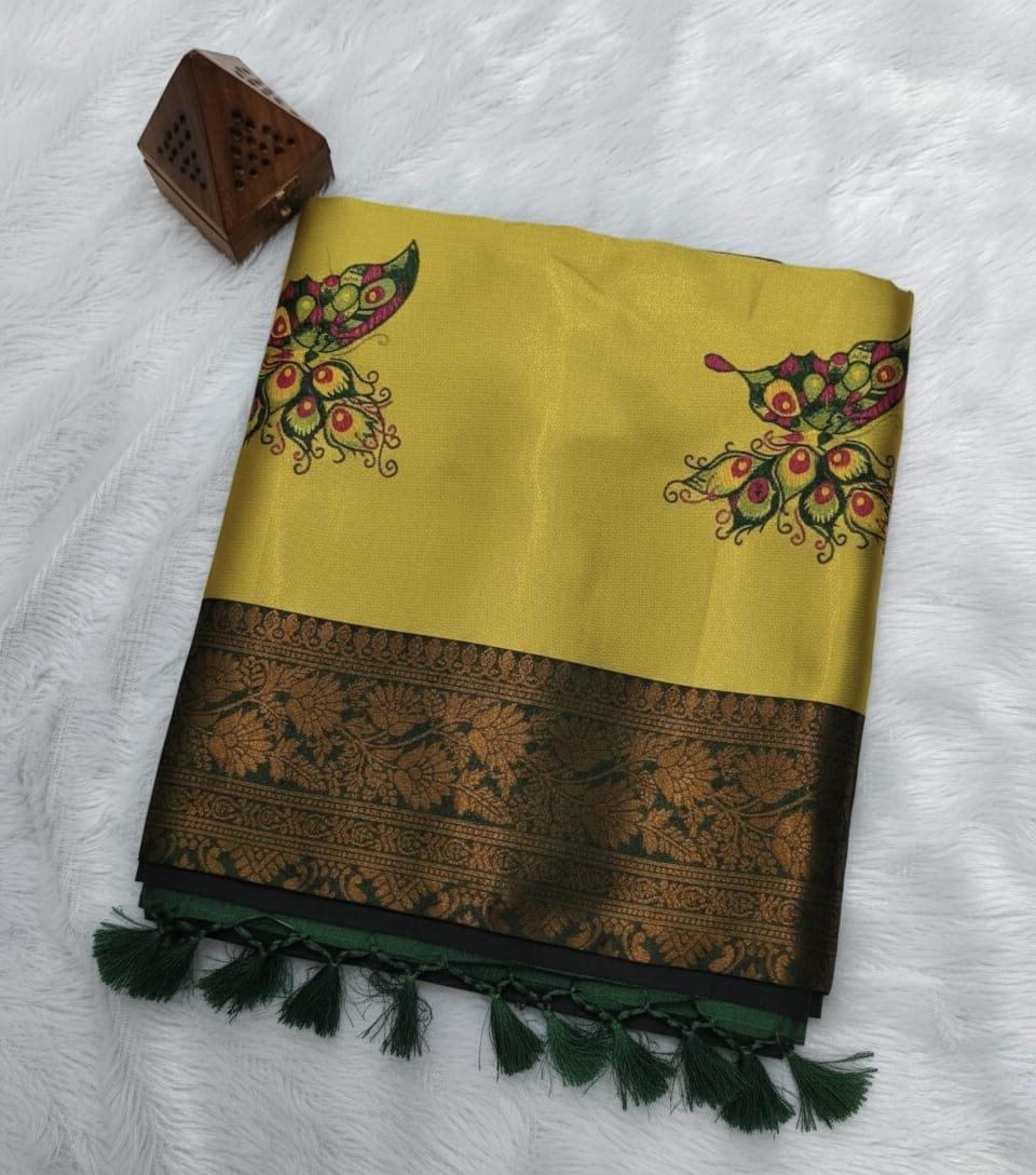 Colour and Fabric: The main body of the saree is a vibrant, luminous golden Green.