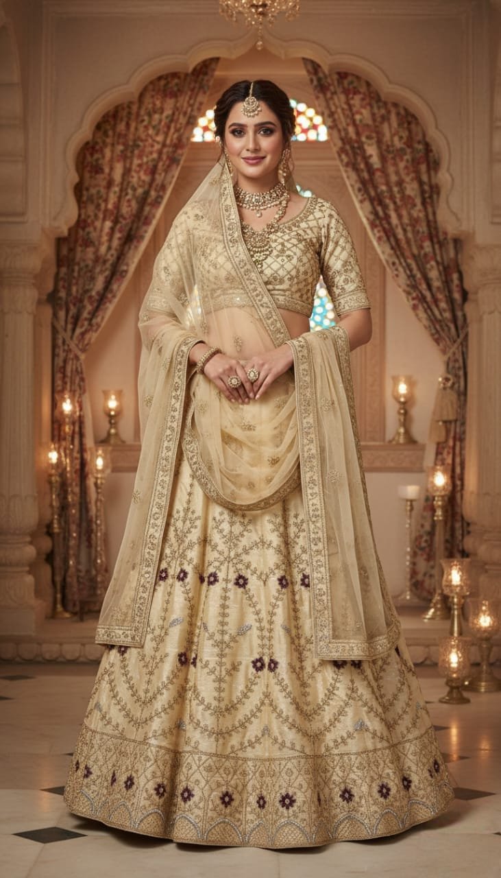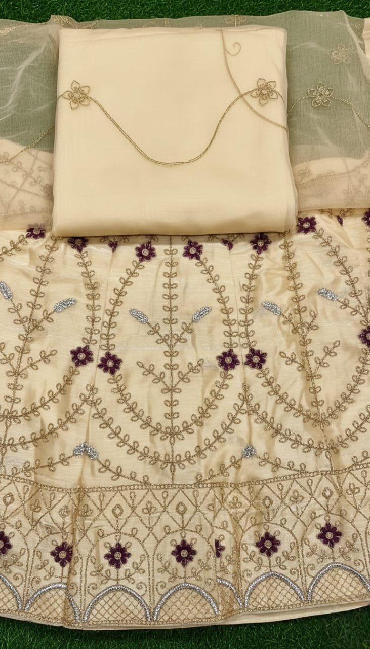Color & Fabric: The primary color is a rich cream or light ivory/beige. The main fabric has a soft sheen, suggesting silk blend or satin.