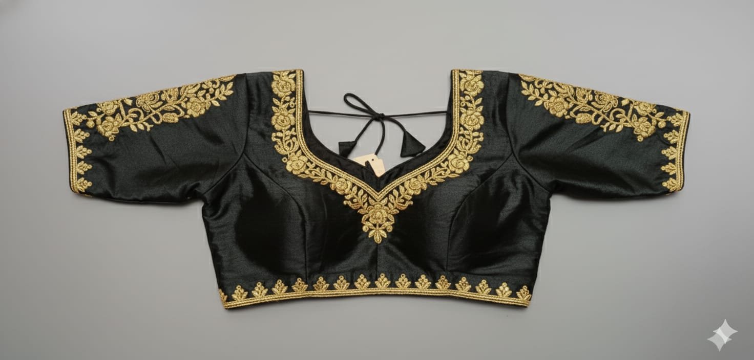This is an elegant and versatile designer blouse crafted from black silk or silk blend fabric, featuring rich gold zari embroidery. The blouse has a classic, flattering silhouette, making it an excellent choice for festive and formal wear.
