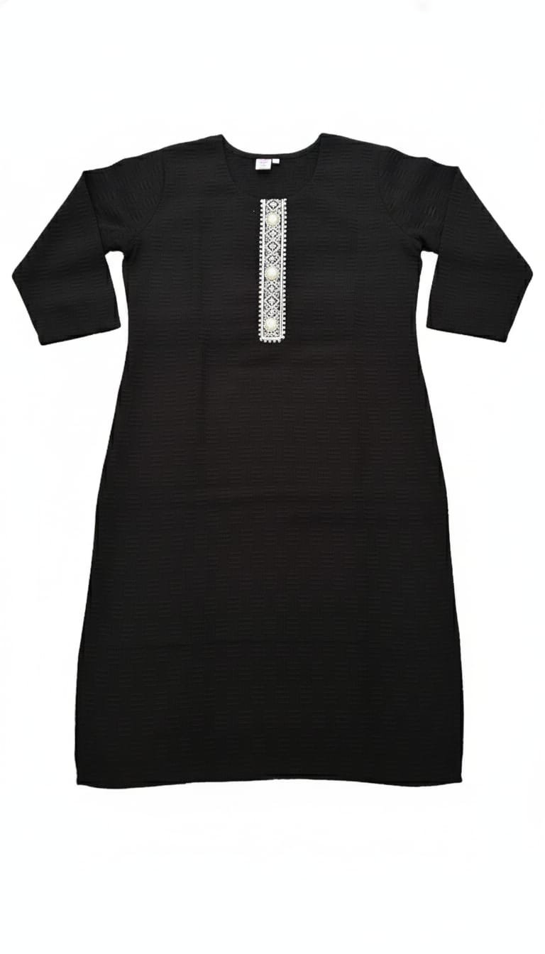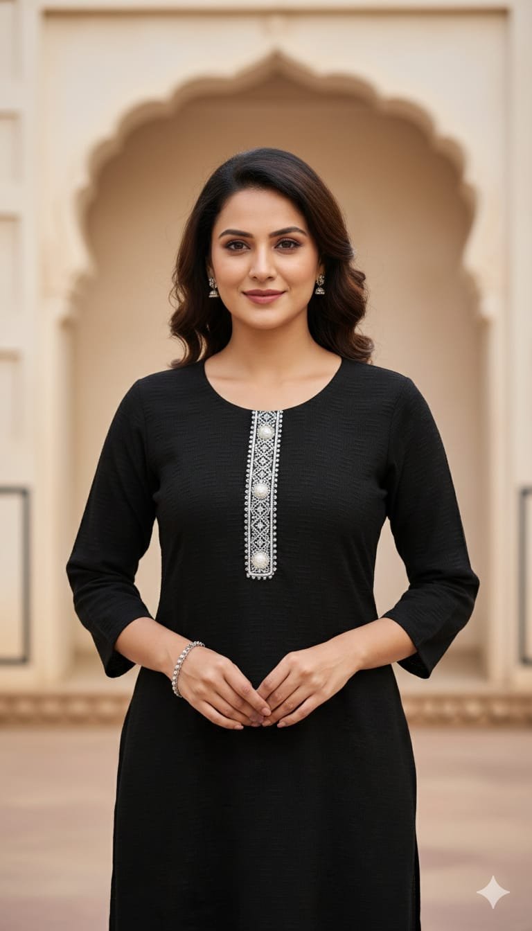 This elegant kurta is suitable for professional environments, casual office wear, sophisticated daytime events, and smart-casual gatherings. Its textured fabric and the striking contrast detail elevate the simple design. It pairs well with black, white, or silver-grey bottoms (leggings, straight pants, or palazzos).
