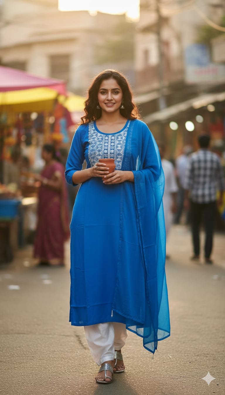 A vibrant royal blue kurta featuring a classic straight silhouette, three-quarter sleeves with a slight puff, and an arresting white geometric embroidery panel across the yoke. It’s a colorful and comfortable piece, perfect for brightening up any casual ensemble.