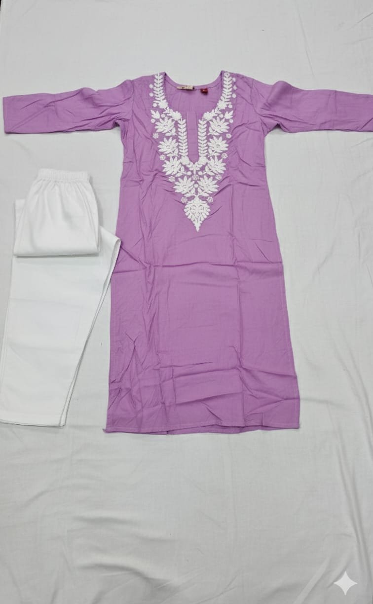 - Kurta: The straight-cut lavender/light purple kurta is the centerpiece, made from a comfortable, breathable fabric (likely cotton or rayon). It features exquisite white embroidery in a traditional Chikankari pattern heavily concentrated around the placket and neckline, creating a rich yoke design. It has a round or V-neck with the embroidery following the contour, and features three-quarter sleeves.