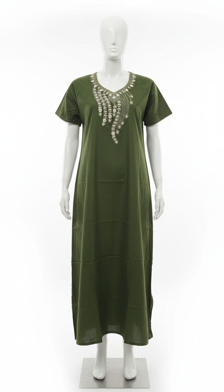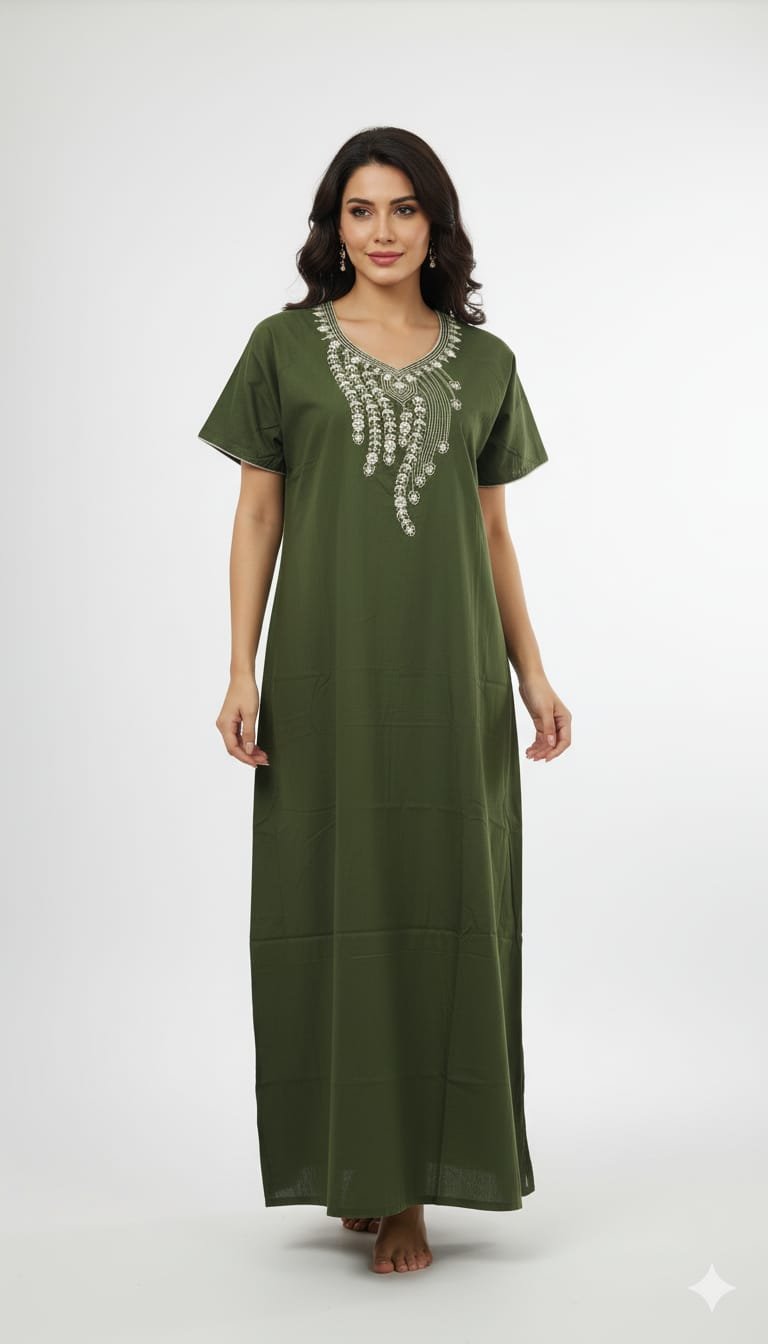 - Color & Fabric: The nighty is rendered in a sophisticated, solid Olive Green (or deep Sage/Khaki), providing a calm and muted aesthetic. It is likely crafted from soft, breathable cotton or a high-quality cotton blend, ideal for comfort in various temperatures.