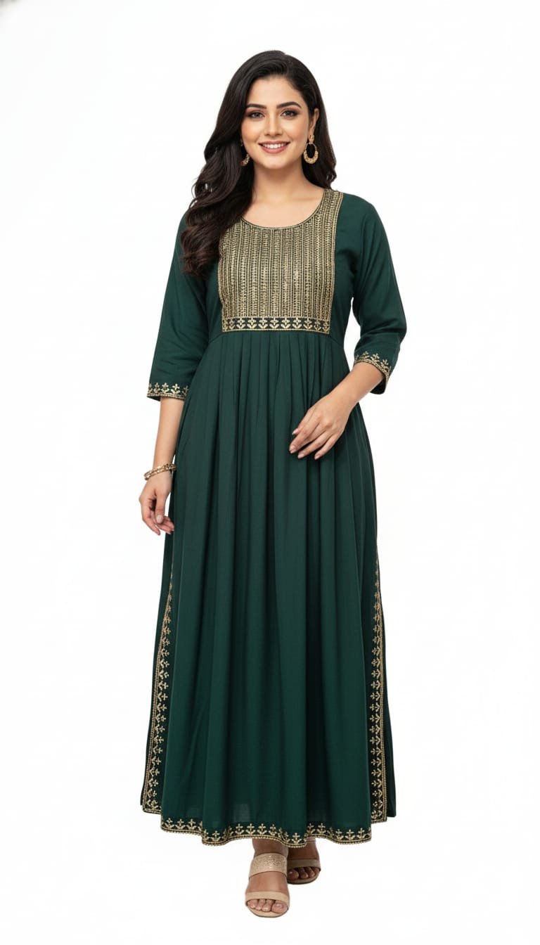 This is a beautiful and elegant dark green Anarkali style kurta featuring exquisite gold-colored embroidery.