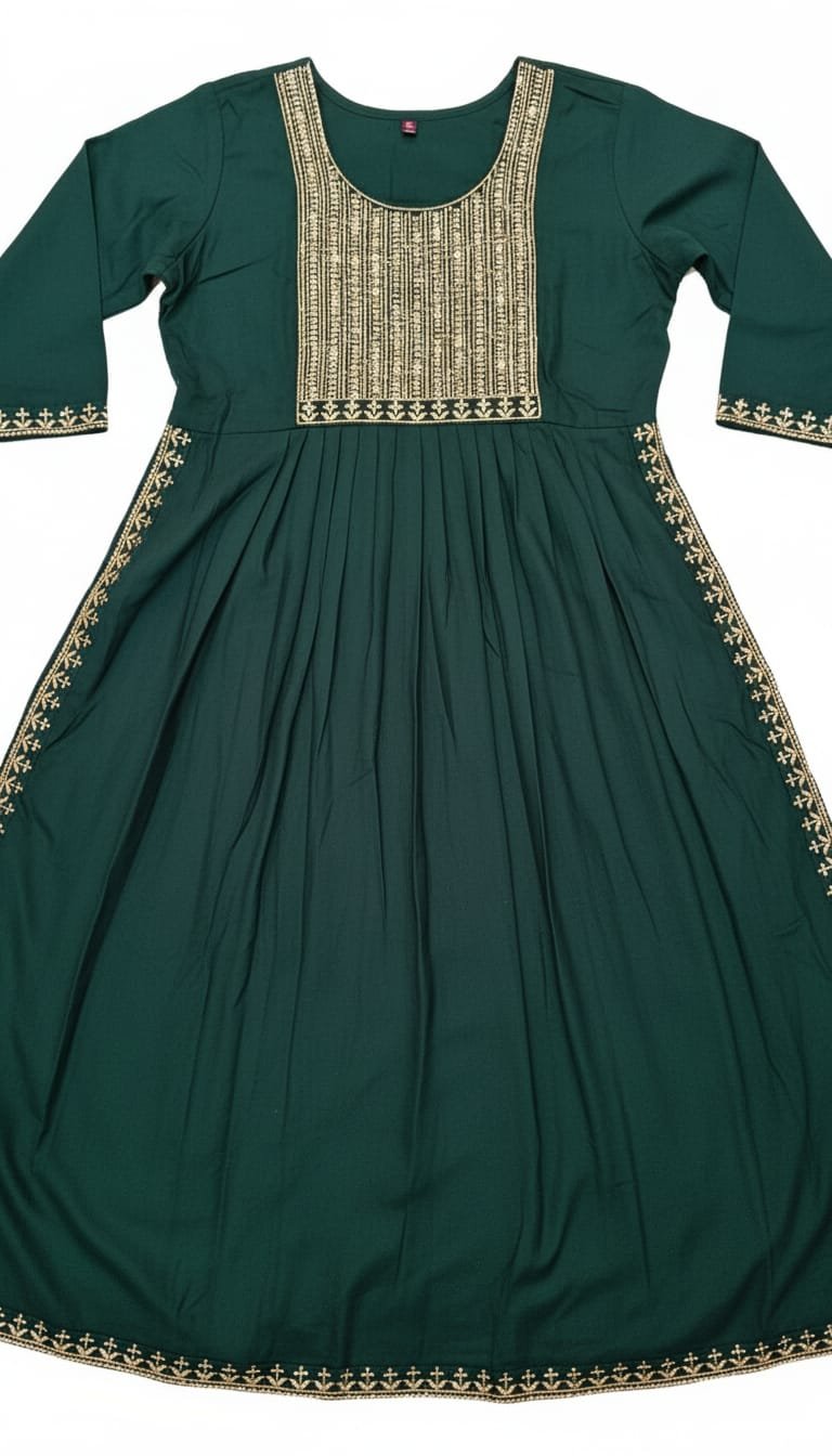 This stunning piece is ideal for festive occasions, casual parties, evening wear, or everyday ethnic wear when paired with leggings, churidar, or palazzos, and complementing footwear. The combination of the deep green colour and rich gold work offers a royal and sophisticated look.