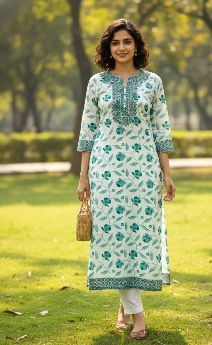 This straight-cut kurti offers a fresh, breezy look with its cool-toned colour palette, perfect for casual or semi-formal daytime wear.