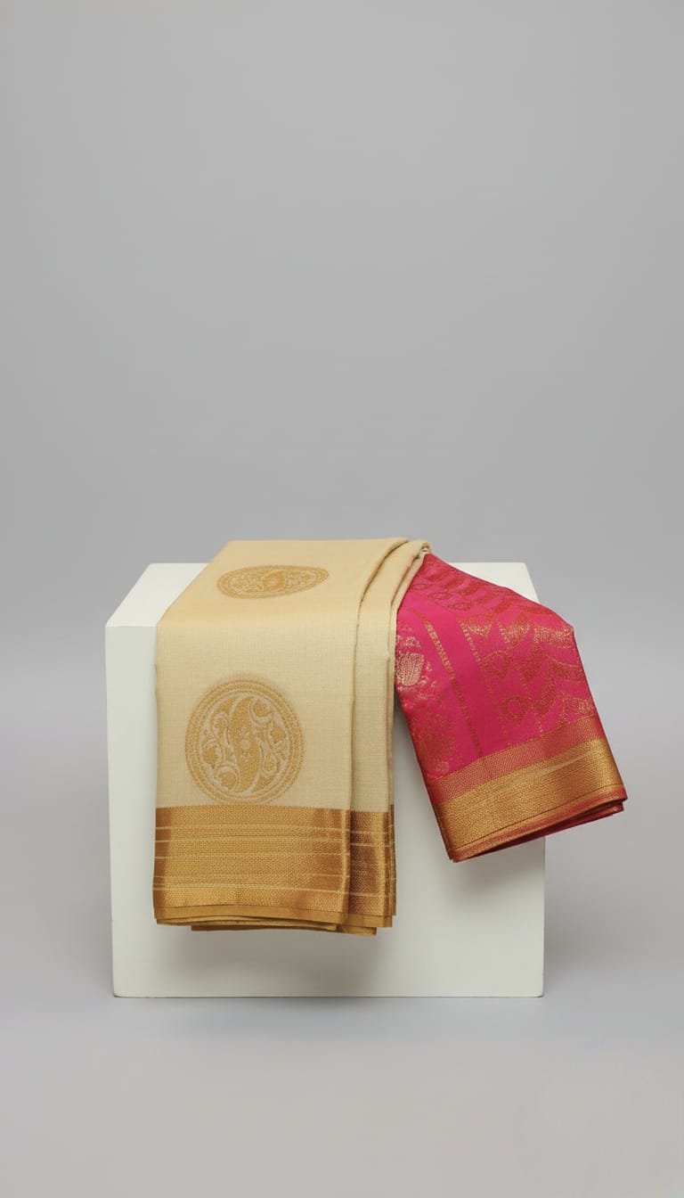 This colour combination is a timeless choice for Indian weddings, religious ceremonies, and formal festive gatherings. The contrast between the subtle cream and the bold pink offers a balanced aesthetic that is both traditional and eye-catching.