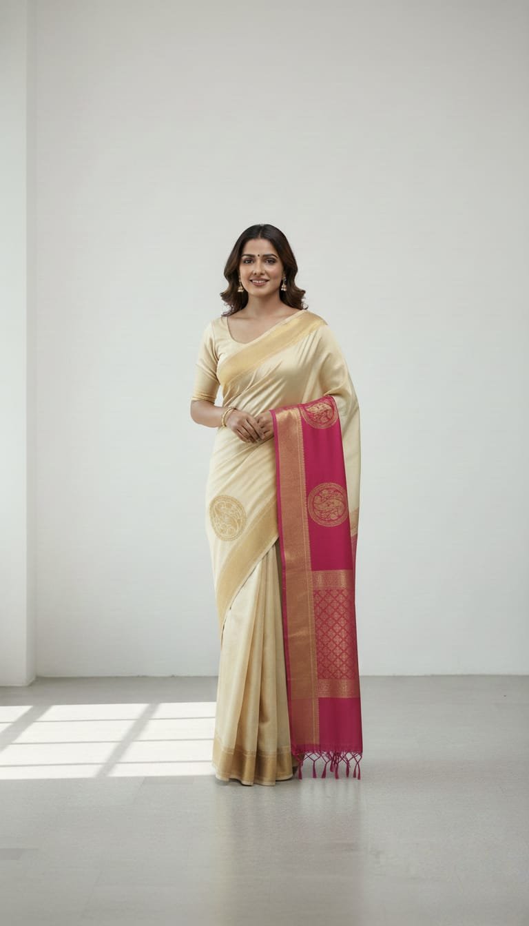 Colour Palette: The main body of the saree is a soft cream or beige, providing a neutral base that makes the accents pop. It is paired with a striking magenta (rani pink) pallu or blouse piece.